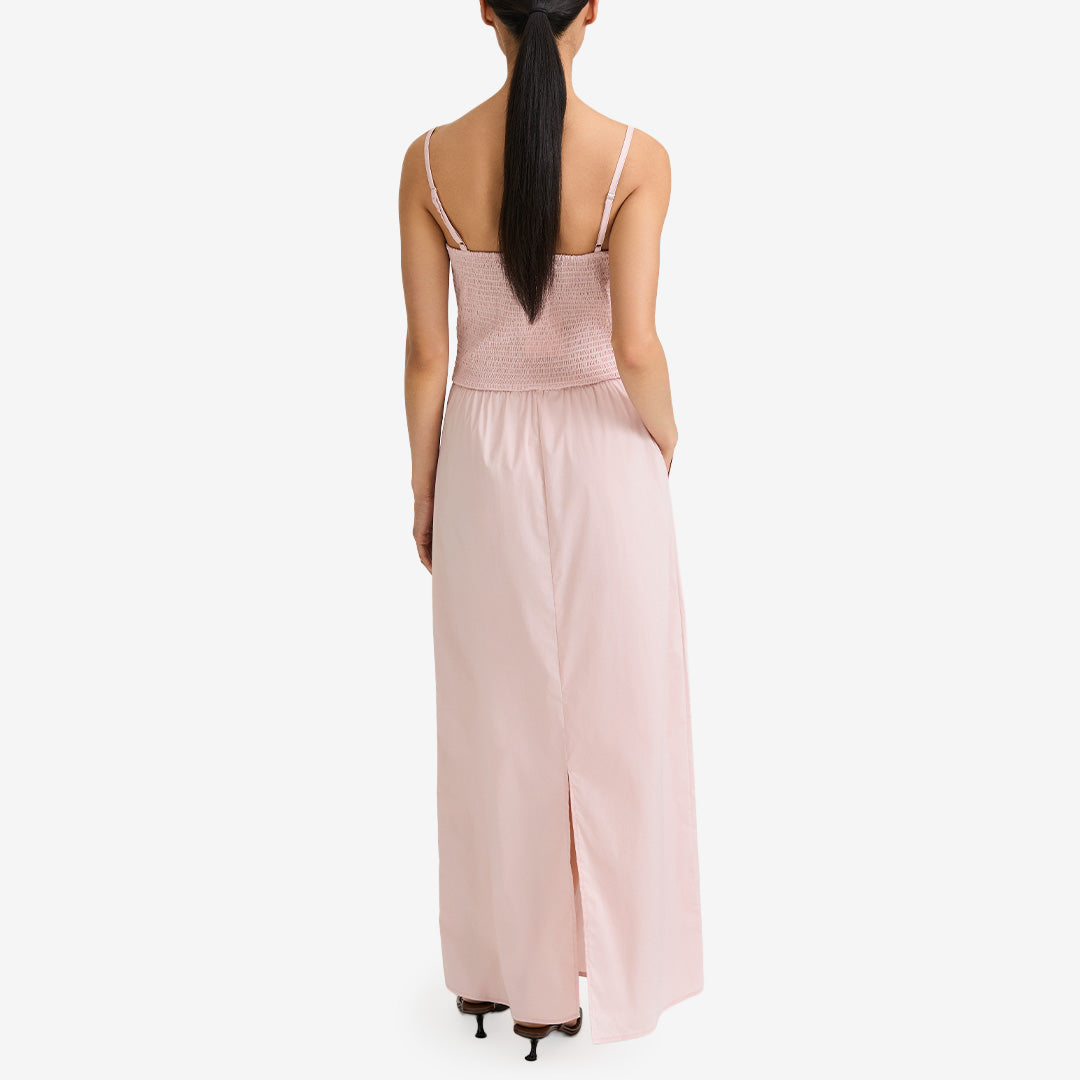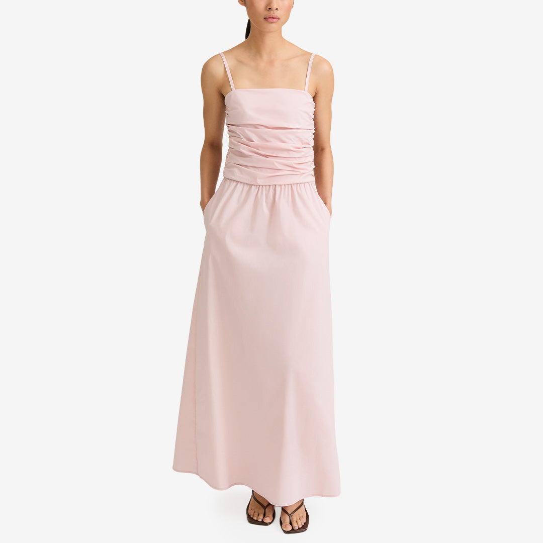Jamila Dress från Stylein är en elegant maxiklänning för sommarens alla festligheter. Klänningen är tillverkad i en mjuk bomullsblandning som ger en luftig och bekväm känsla. Den draperade framsidan och den lätt rynkade raka kjolen skapar ett fint fall och rörelse i plagget. Baktill finns smockdetaljer som ger en smickrande passform, medan de justerbara och avtagbara axelbanden gör klänningen mångsidig och enkel att anpassa efter stil och tillfälle.