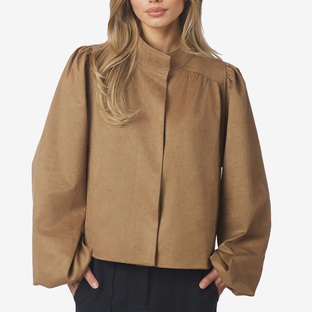 Neo Noir kort jacka cognac för dam med hög krage och vida ärmar