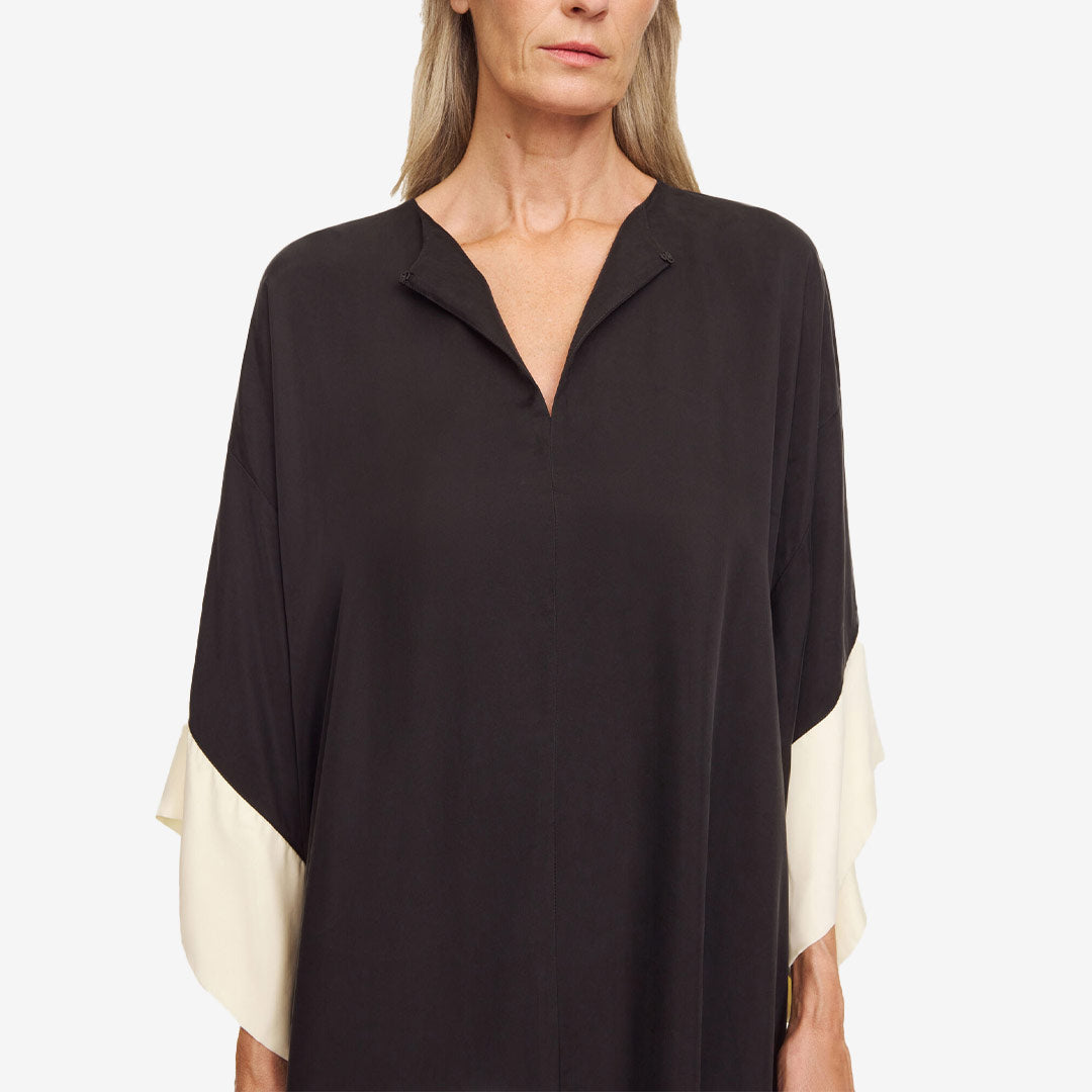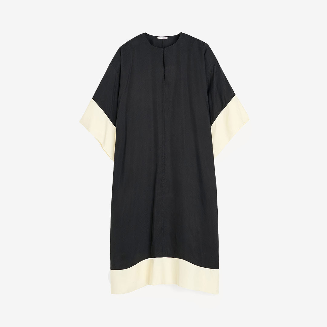Cicine från By Malene Birger är en elegant maxiklänning i mjuk cuproblandning med exklusivt fall. Den raka, avslappnade silhuetten kombineras med vida ärmar och nedhasade axlar för ett modernt uttryck. Den djupa halsringningen kan bäras öppen eller stängd beroende på stil och tillfälle. En stilren klänning som passar lika bra till semester som till middagar och festliga tillfällen.