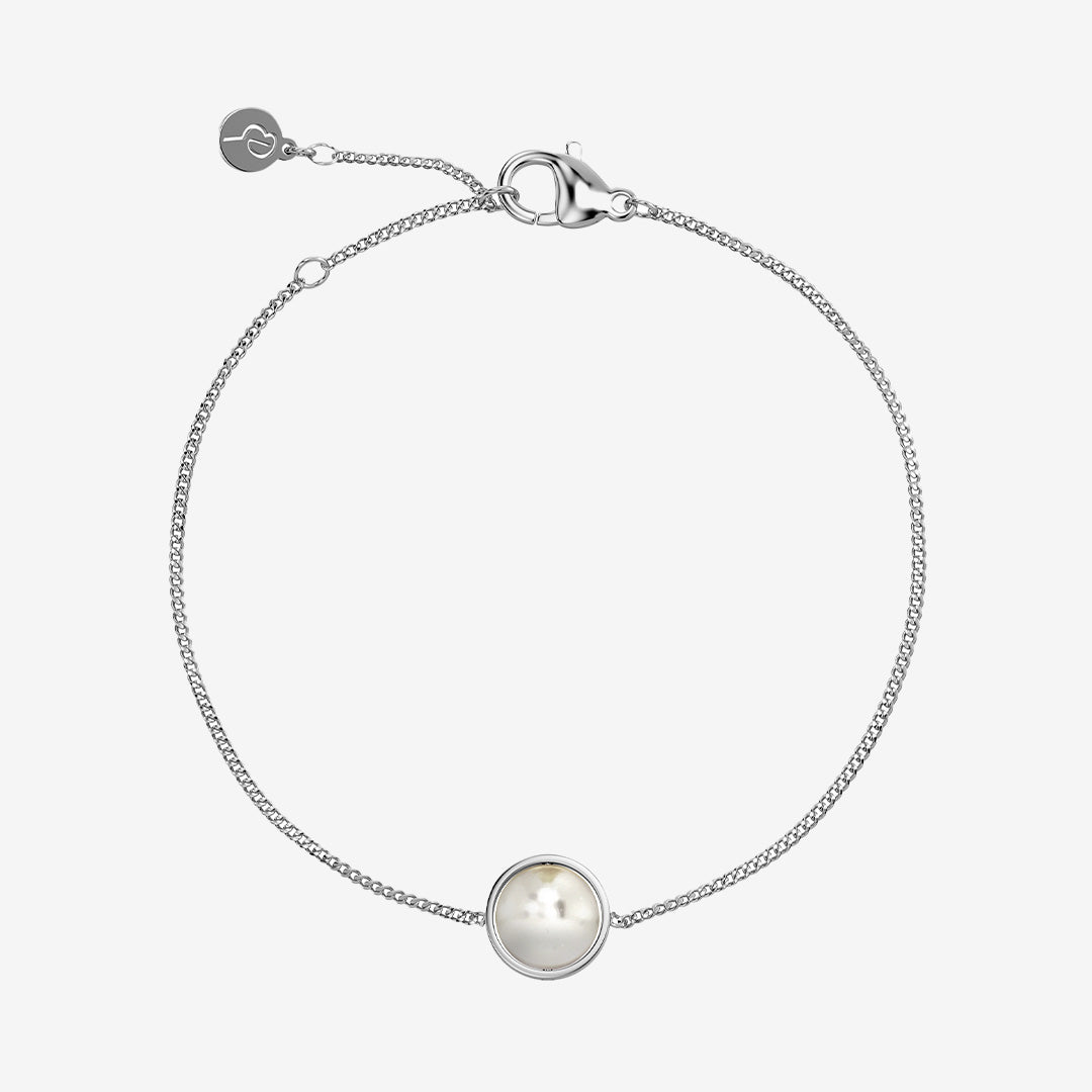 Gabrielle kombinerar kedjor och pärlor för en modern, polerad look. Här i ett armband i blankt rostfritt stål med en pärlemorpärla fäst direkt på kedjan – ett elegant smycke som passar både till vardag och festliga tillfällen.