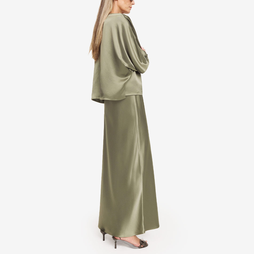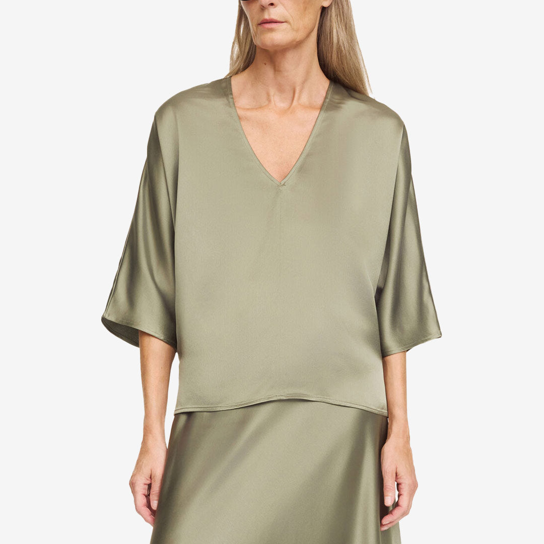 Lucia från By Malene Birger är en stilren satinblus med lös passform och elegant fall. V-ringningen tillsammans med dolmanärmar ger ett mjukt och modernt uttryck medan de korta sidoslitsarna skapar en avslappnad silhuett. Blusen passar lika bra till kostymbyxor för arbete som till jeans för en mer ledig stil.