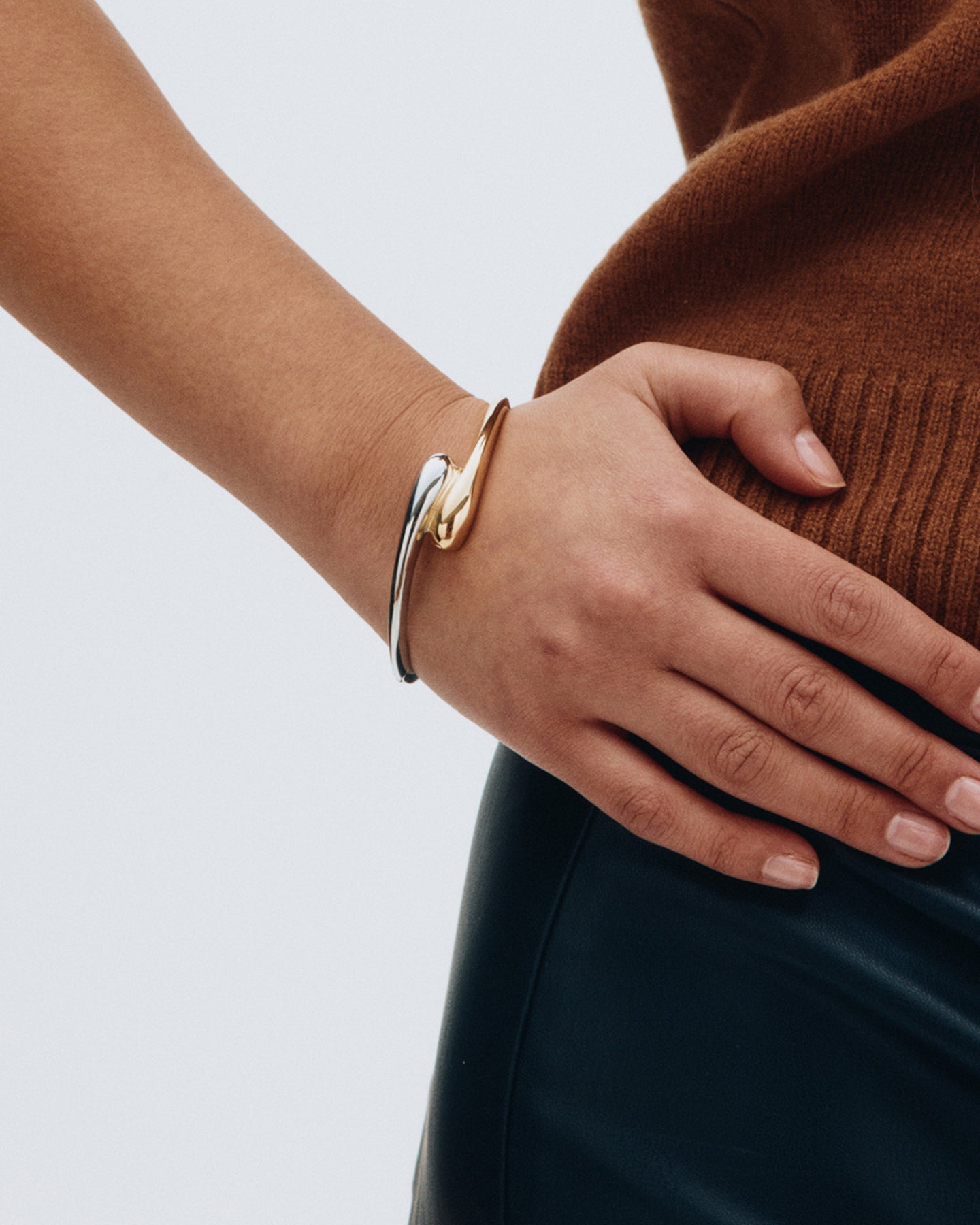 Harmony bangle har en elegant droppform som kombinerar två metaller i perfekt balans. Den stilrena designen blandar blankt rostfritt stål med 14K guldplätering och stängs med ett dolt knäppe som ger ett enhetligt uttryck.