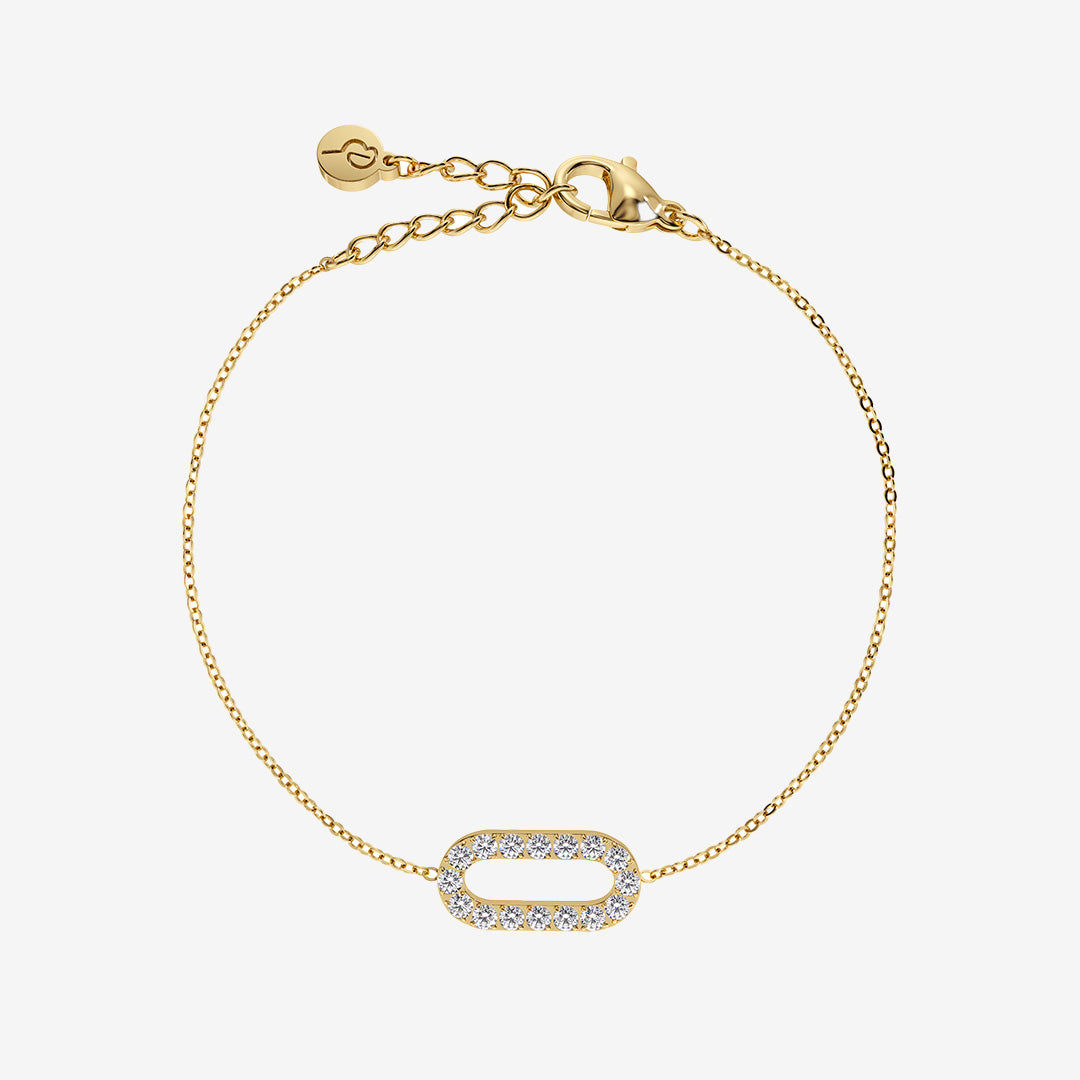 Inez kombinerar glittrande stenar med strama, geometriska former. Detta eleganta armband i 14K guldpläterat rostfritt stål har en fasettslipad ankarkedja som ger ett tidlöst och sofistikerat uttryck. Passar perfekt till vardag och festligare tillfällen.