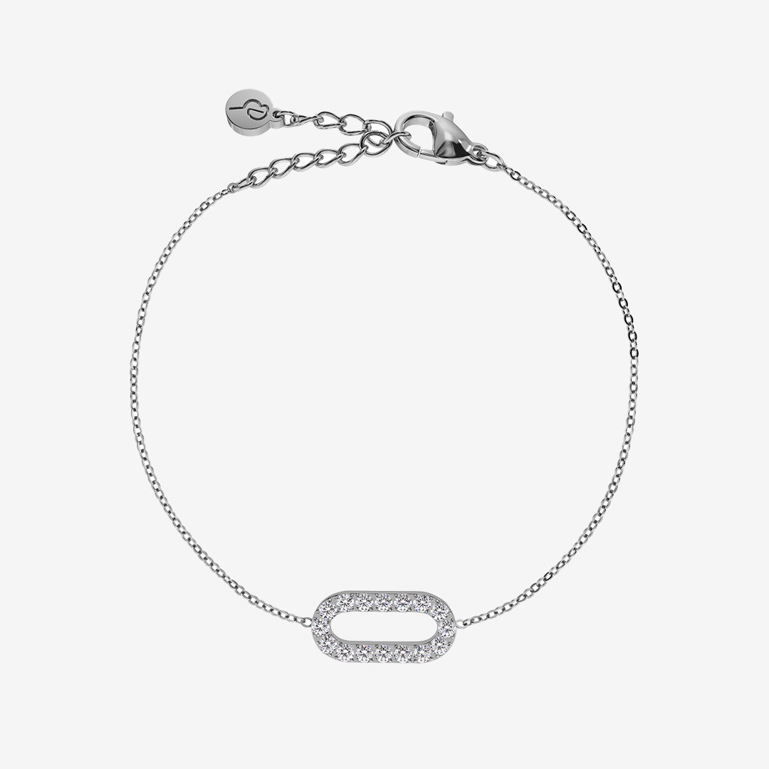 Inez kombinerar glittrande stenar med strama, geometriska former. Detta eleganta armband i blankt rostfritt stål har en fasettslipad ankarkedja som ger ett tidlöst och sofistikerat uttryck. Passar lika bra till vardag som till festligare tillfällen.