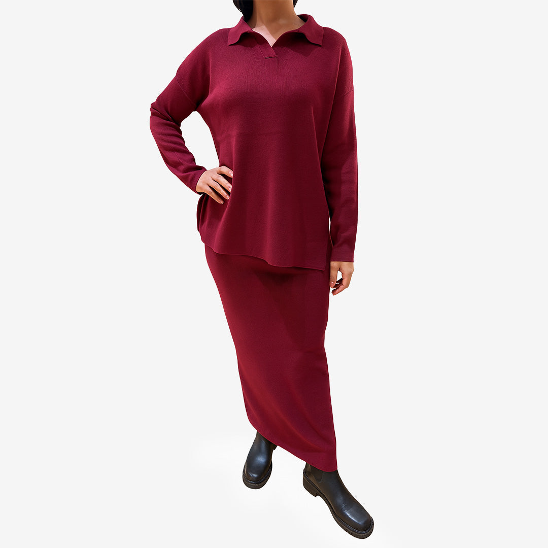 Stickat set som består av en stilren tröja med krage och matchande kjol i en behaglig viskos- och polyamidblandning. Setet erbjuder en enhetlig och elegant look som kombinerar komfort med tidlös stil.