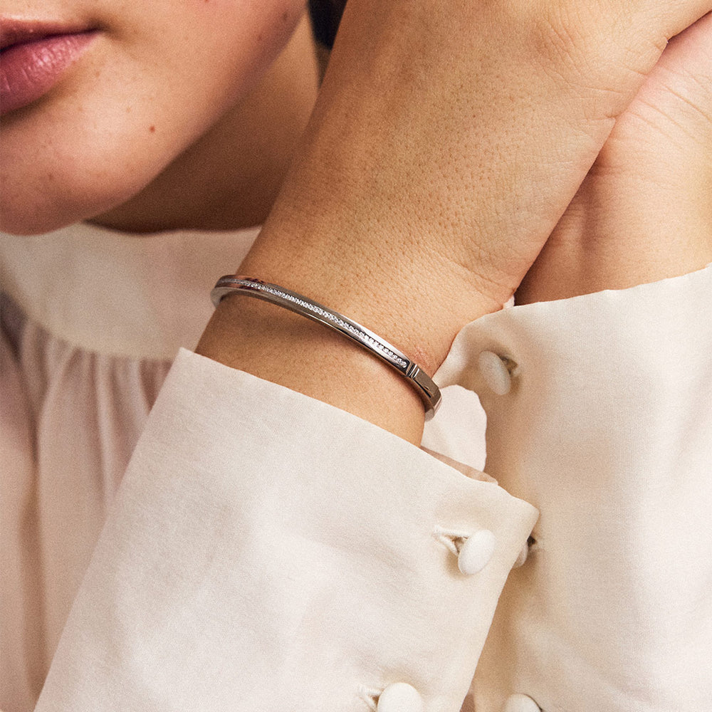 Vår klassiska serie Josefin ses här i ett bangle med stenar satta på den övre halvan i en smal nedsänkt rand. Josefin bangle blir favoriten som du bär som det är, eller ihop med flera armband i layering. Josefin bangle ses här i blankt rostfritt stål.