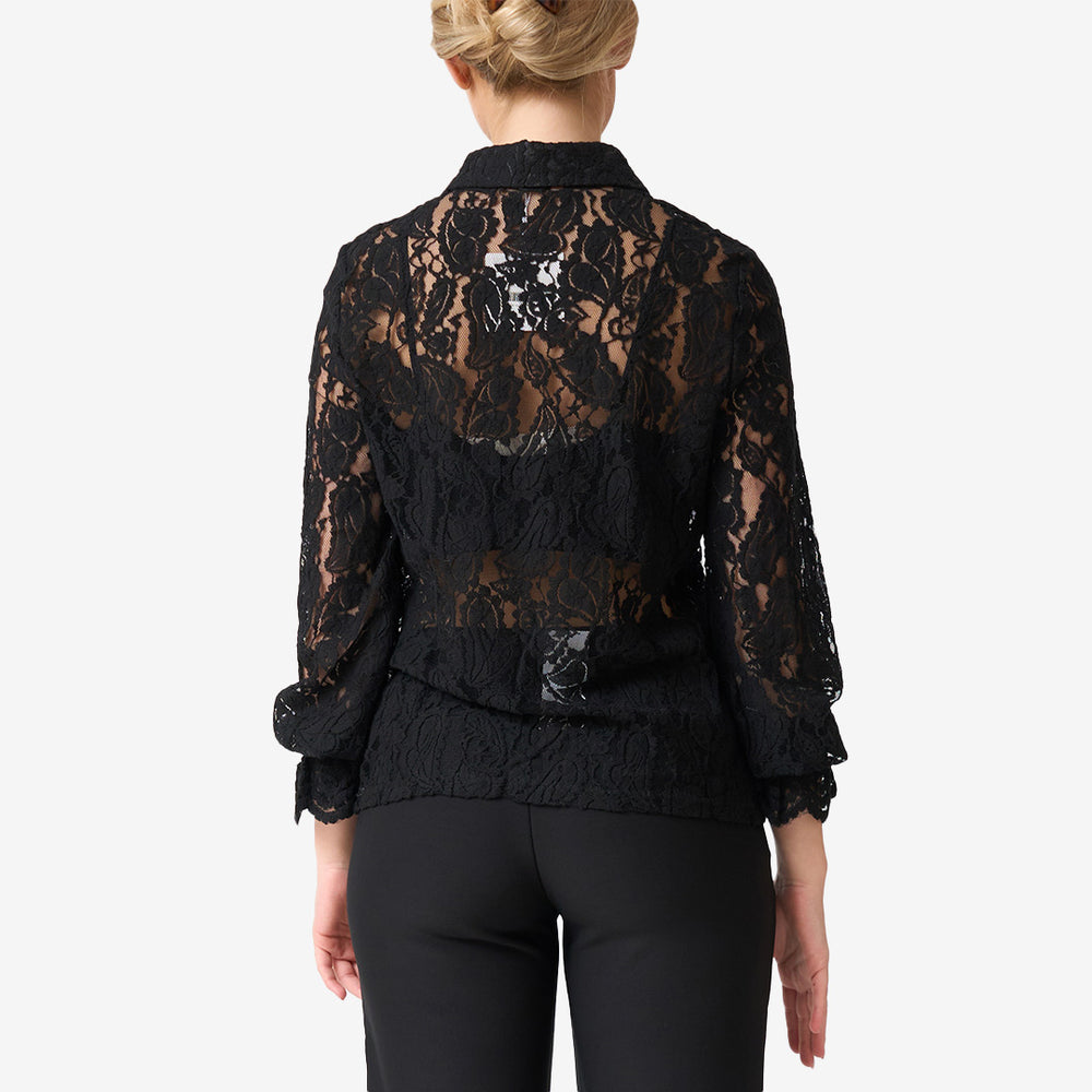 Elegant spetsblus i svart med feminina detaljer och figurnära passform. Perfekt för både vardag och festligare tillfällen. Det stretchiga materialet ger god komfort samtidigt som spetsen tillför en romantisk och stilren känsla. Lika fin att bära som den är eller under en kavaj.