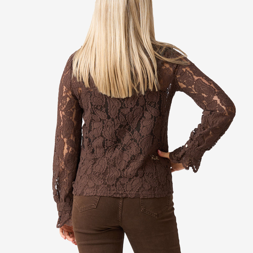 Elegant spetsblus i brunt med feminina detaljer och figurnära passform. Perfekt för både vardag och festligare tillfällen. Det stretchiga materialet ger god komfort samtidigt som spetsen tillför en romantisk och stilren känsla. Lika fin att bära som den är eller under en kavaj.
