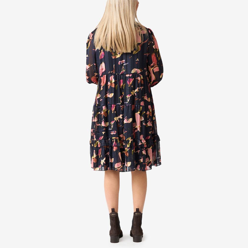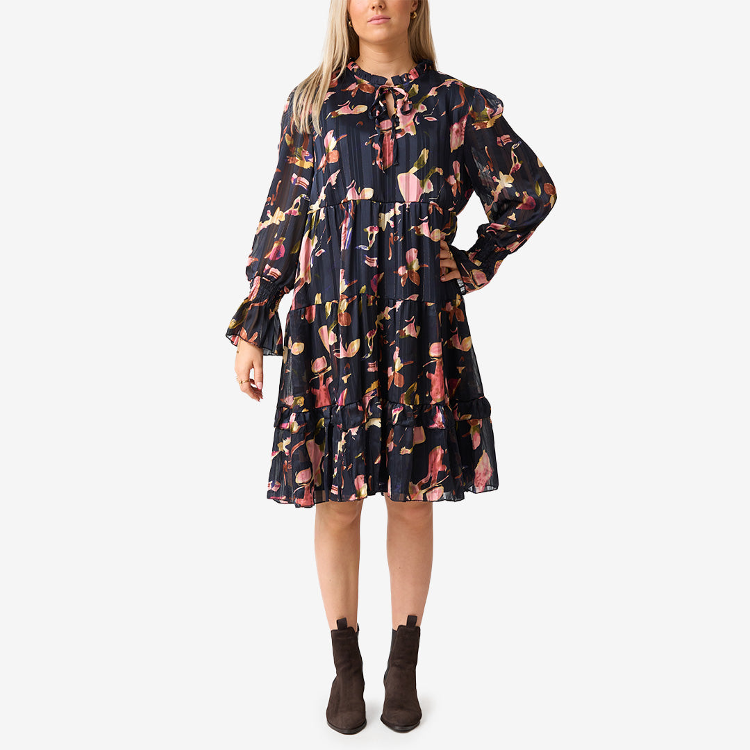Blommig klänning i svart bas – en feminin och luftig modell som passar lika bra till vardag som till festligare tillfällen. Den lätta polyesterkvaliteten ger ett fint fall och behaglig känsla mot huden. Enkel att bära både till vardags med sneakers och med klackar till fest.