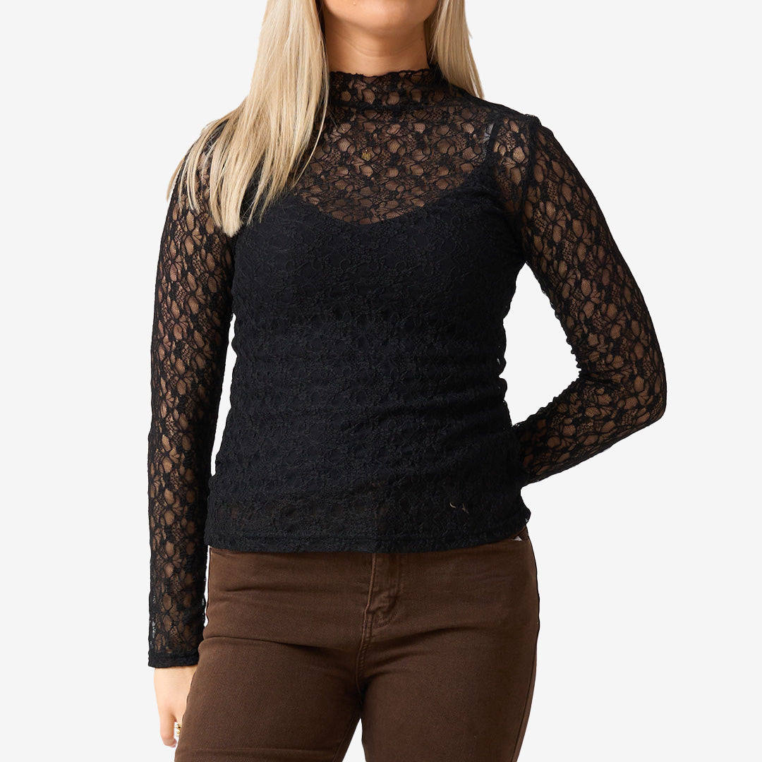 Spetstopp i svart med vacker struktur och mjuk stretch för en skön och kroppsnära passform. Detaljerna i spets ger en romantisk känsla. Ett plagg som är lätt att bära både ensam och under kavaj eller kofta.
