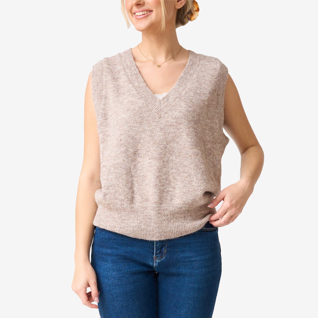 Stickad väst i en fin beige färg, perfekt för lager på lager under säsongens kyligare dagar. Den mjuka, strukturerade stickningen kombinerat med en avslappnad passform gör västen både bekväm och lätt att styla över skjorta, topp eller klänning.