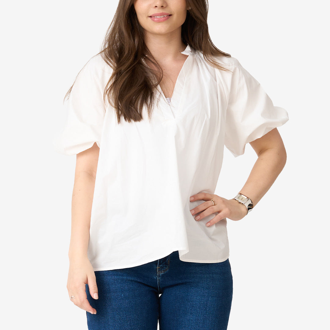 En elegant topp med ballongärm som skapar volym och ett feminint uttryck. En stilren topp som passar lika bra till vardags som till mer uppklädda tillfällen.