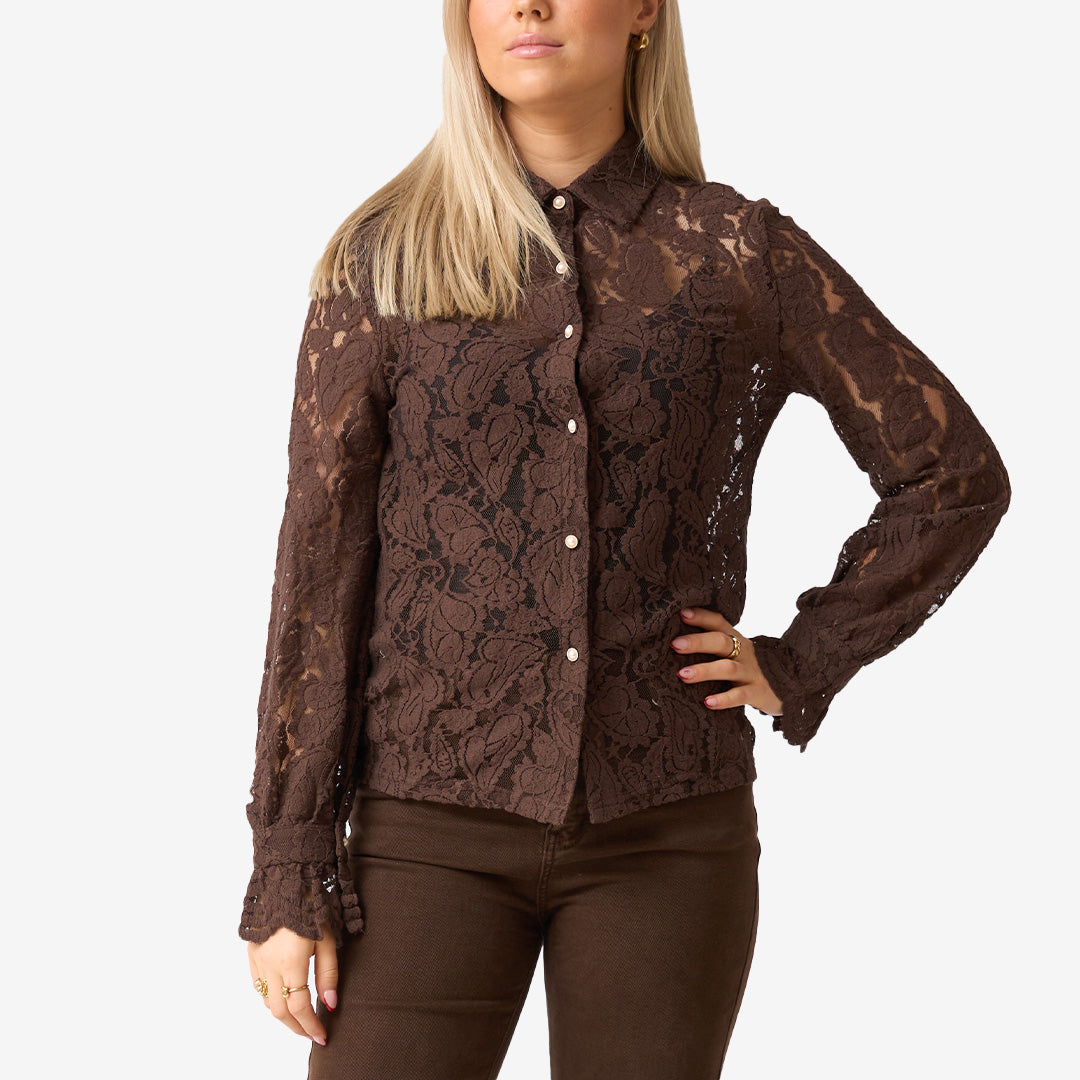 Elegant spetsblus i brunt med feminina detaljer och figurnära passform. Perfekt för både vardag och festligare tillfällen. Det stretchiga materialet ger god komfort samtidigt som spetsen tillför en romantisk och stilren känsla. Lika fin att bära som den är eller under en kavaj.