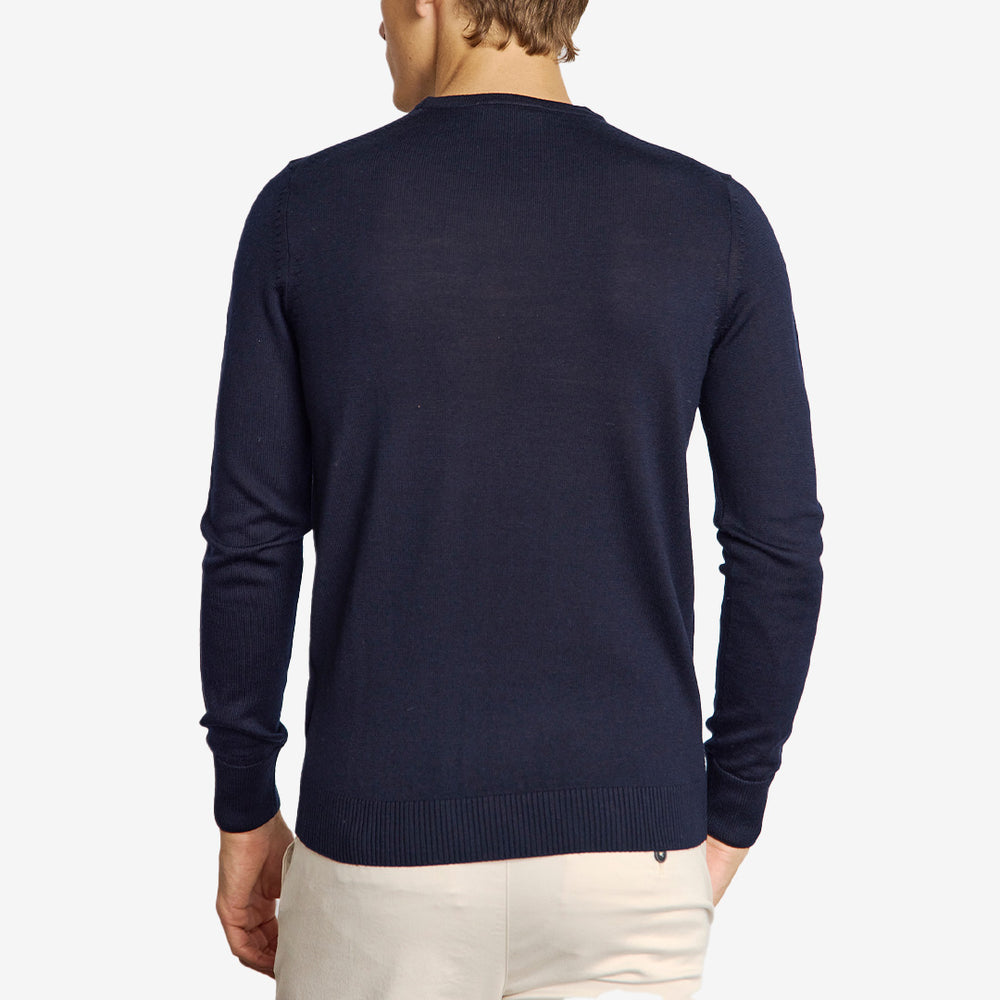En klassisk rundhalsad stickad tröja i en mjuk blandning av 50 % extrafin merinoull och 50 % akryl. Den marinblåa färgen ger ett fräscht uttryck som passar perfekt till både avslappnade och mer uppklädda tillfällen. Regular fit ger en bekväm passform och tröjan fungerar lika bra över en skjorta som ensam.