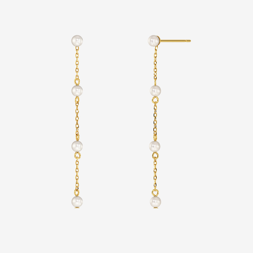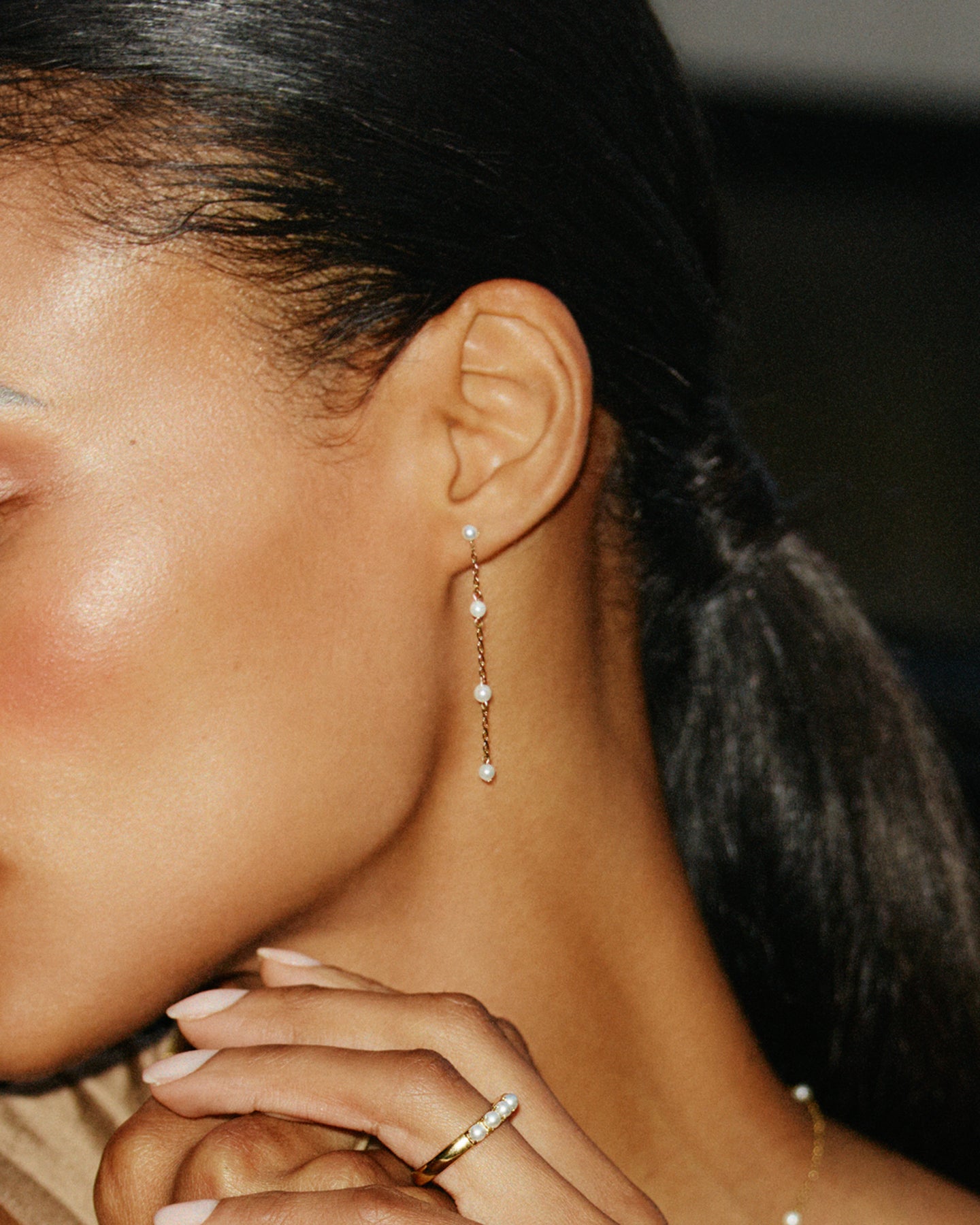 Minipärlor karakteriserar Lilo. Dessa långa örhängen i 14K guldplätering på rostfritt stål sitter elegant på örat och ger en tidlös, feminin touch. Storlek 3 mm, längd 5 cm. Pärlemorpärla, blank 14K guldplätering på rostfritt stål. Passar lika bra till vardag som till festligare tillfällen.