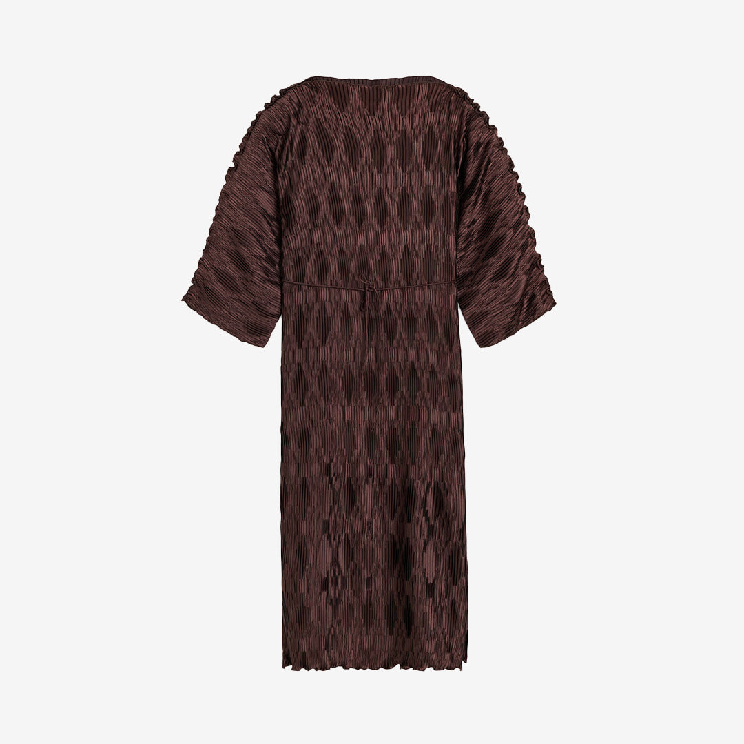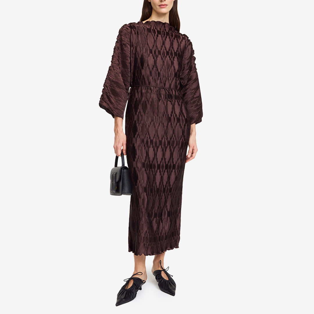 Tralaido-klänningen är tillverkad i ett mjukt och skimrande plissétyg, perfekt för kvällens tillfällen. Klänningen har en lös passform med avtagbart och justerbart bälte, en ankellång silhuett, båtringning och vida ärmar med sidospår.